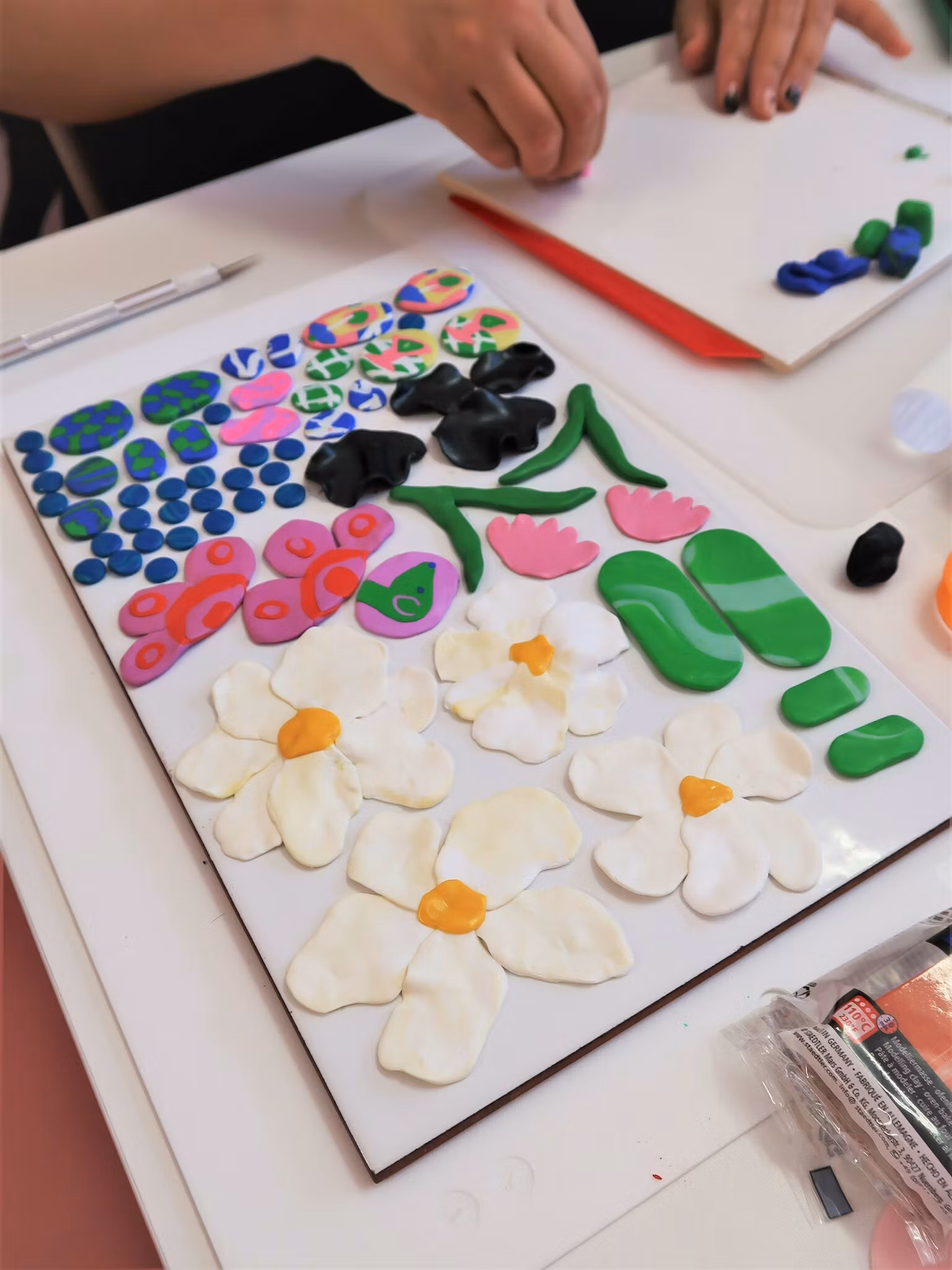 Därefter väljer du färger och smyckesdelar, blandar och kavlar leran och formar dina örhängen, med hjälp från Clara Fina som finns till ditt förfogande under hela processen!