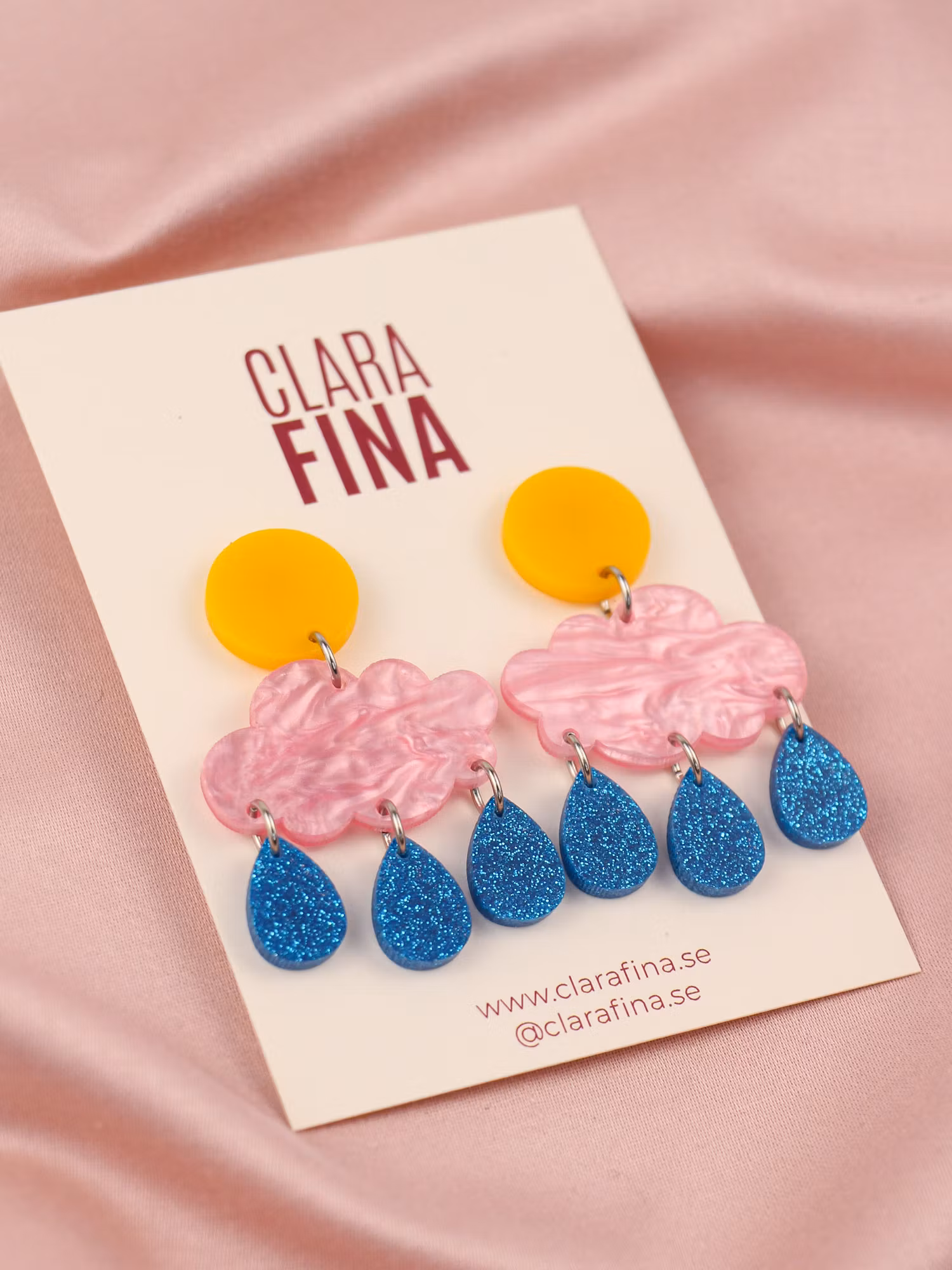 Efter regn kommer solsken! Detta härligt dinglande par med sol, moln och glittriga regndroppar påminner dig om just det, varje dag.
